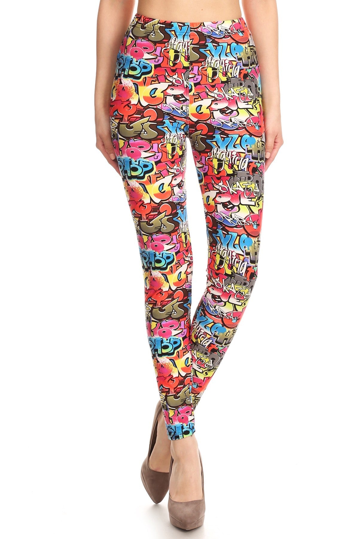 Multicolored graffiti print, super soft peach-skin leggings with a fitted elastic waist band