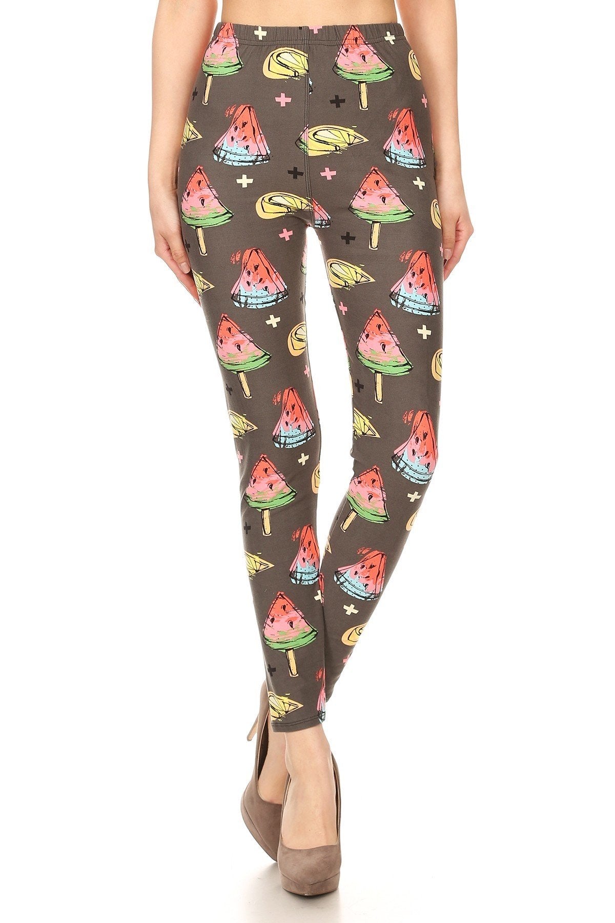 Watermelon print high waist leggings in a fitted style, with an elastic waistband.