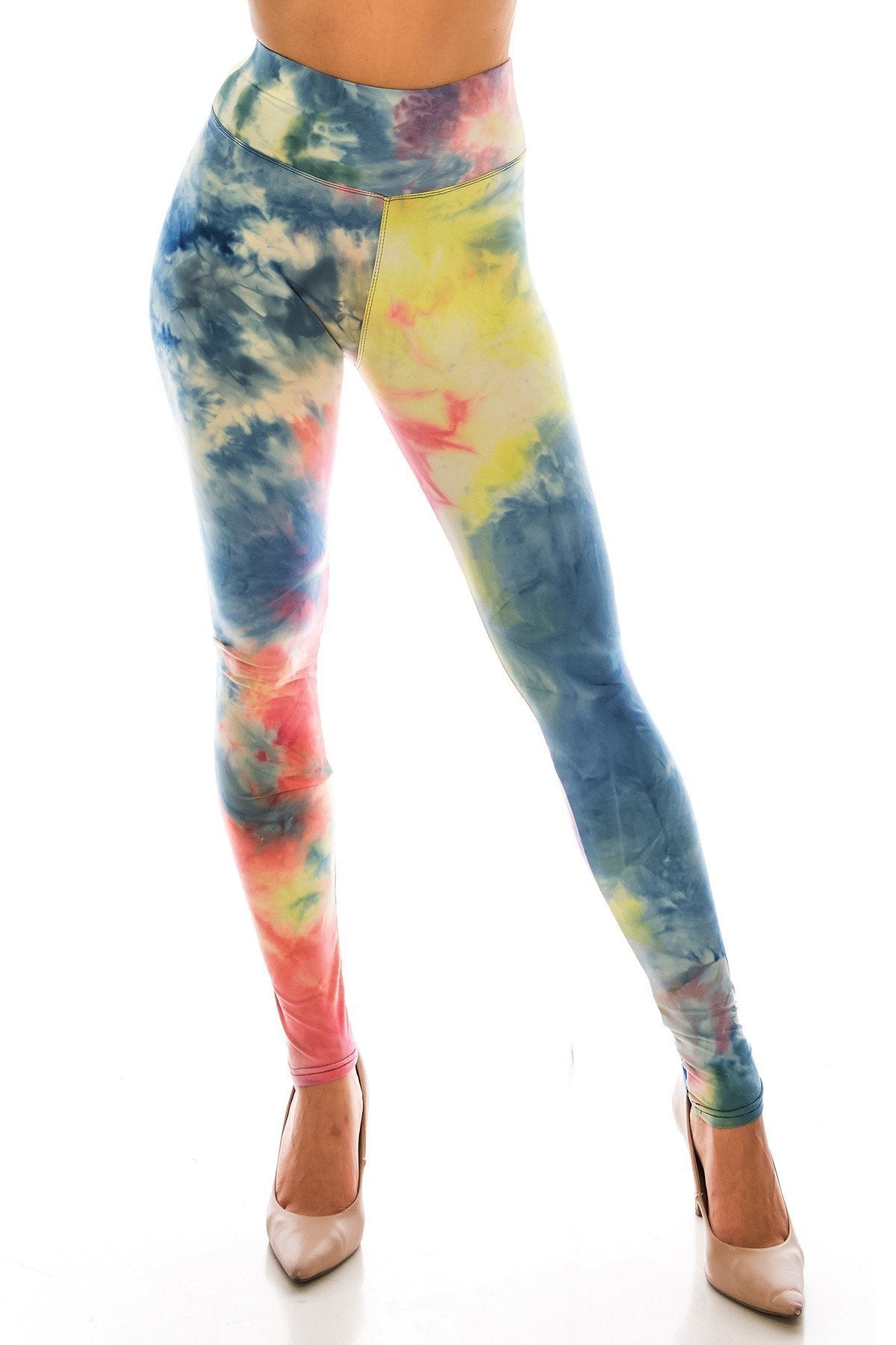 Multicolored tie dye print, super soft peach-skin leggings with a fitted elastic yoga waist band